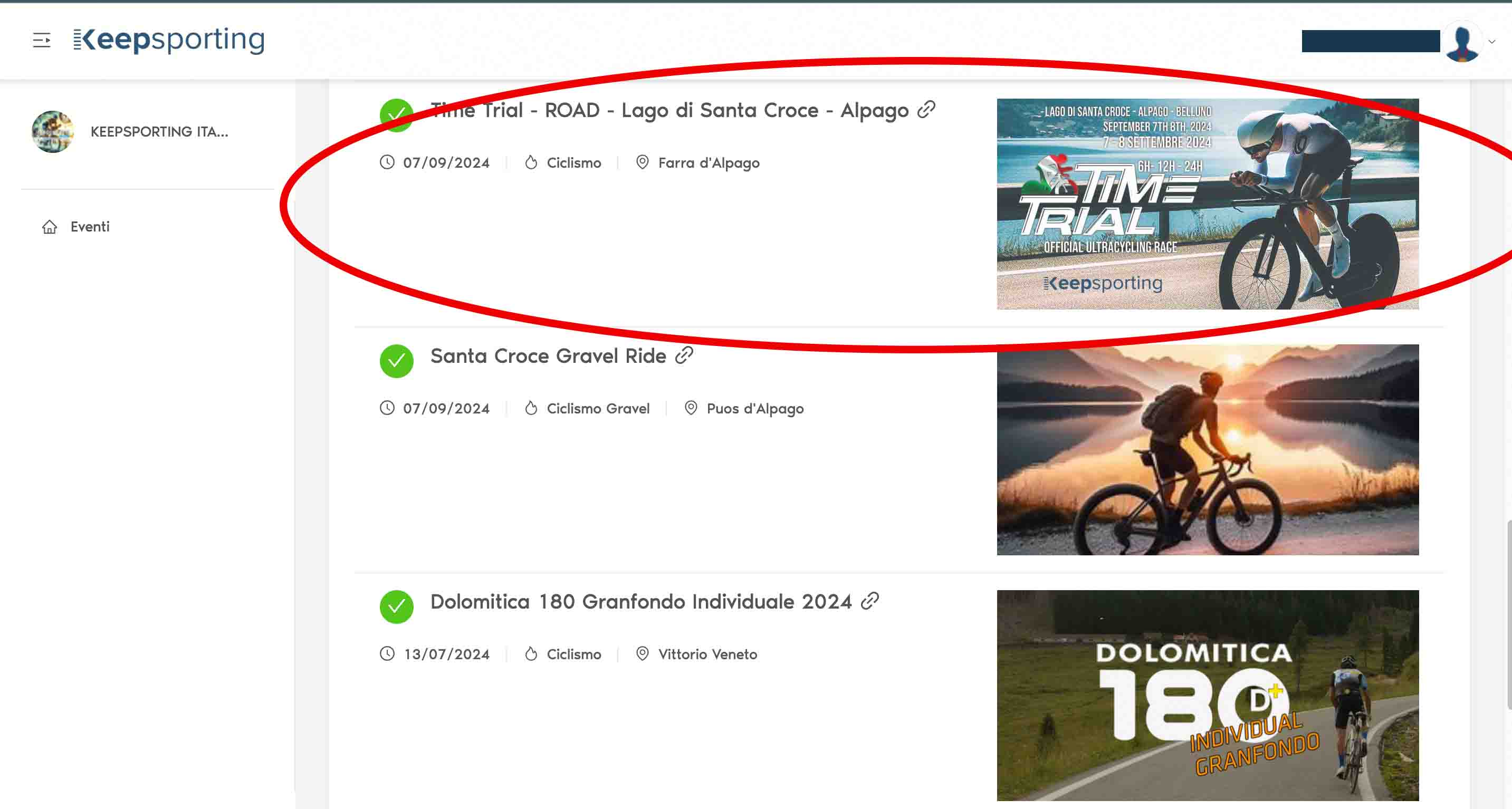 In our case, we will take 'Time Trial - ROAD - Lago di Santa Croce - Alpago' as a reference and click on the event to proceed.
