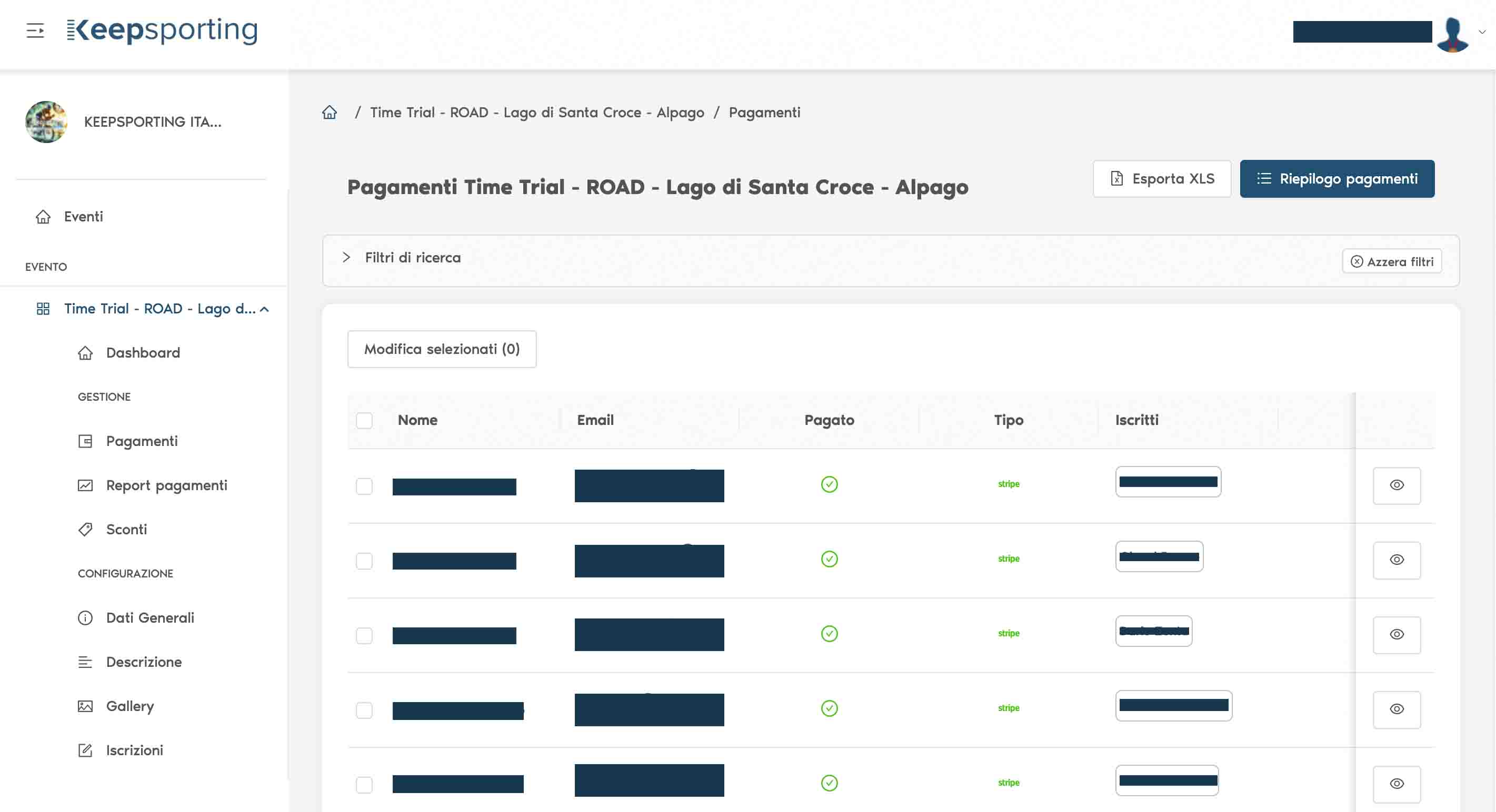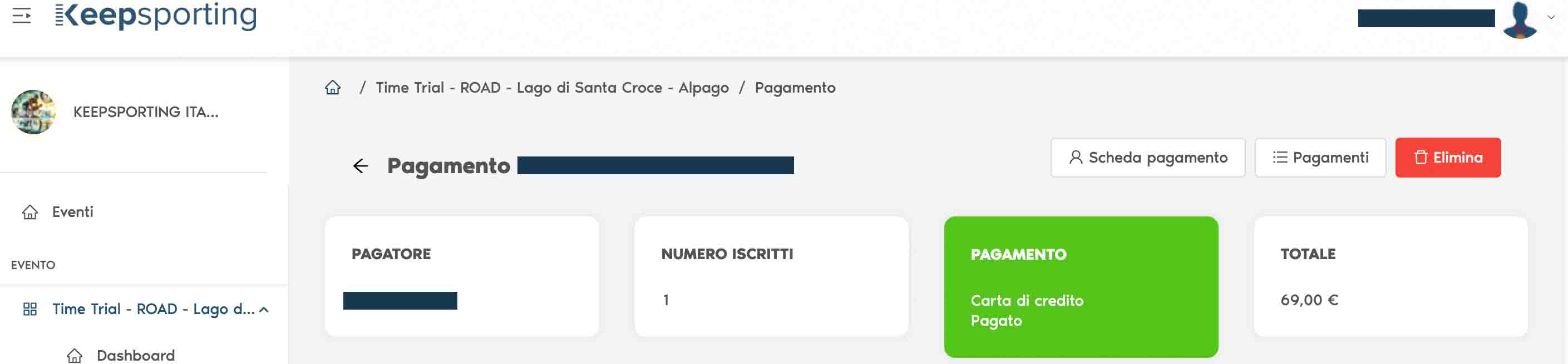 Once in 'PAYMENTS', you will see the list of athletes who have already registered for your event. At this point, scroll through the list to find the athlete whose registration you want to delete (you can find them more easily using the search filters).
