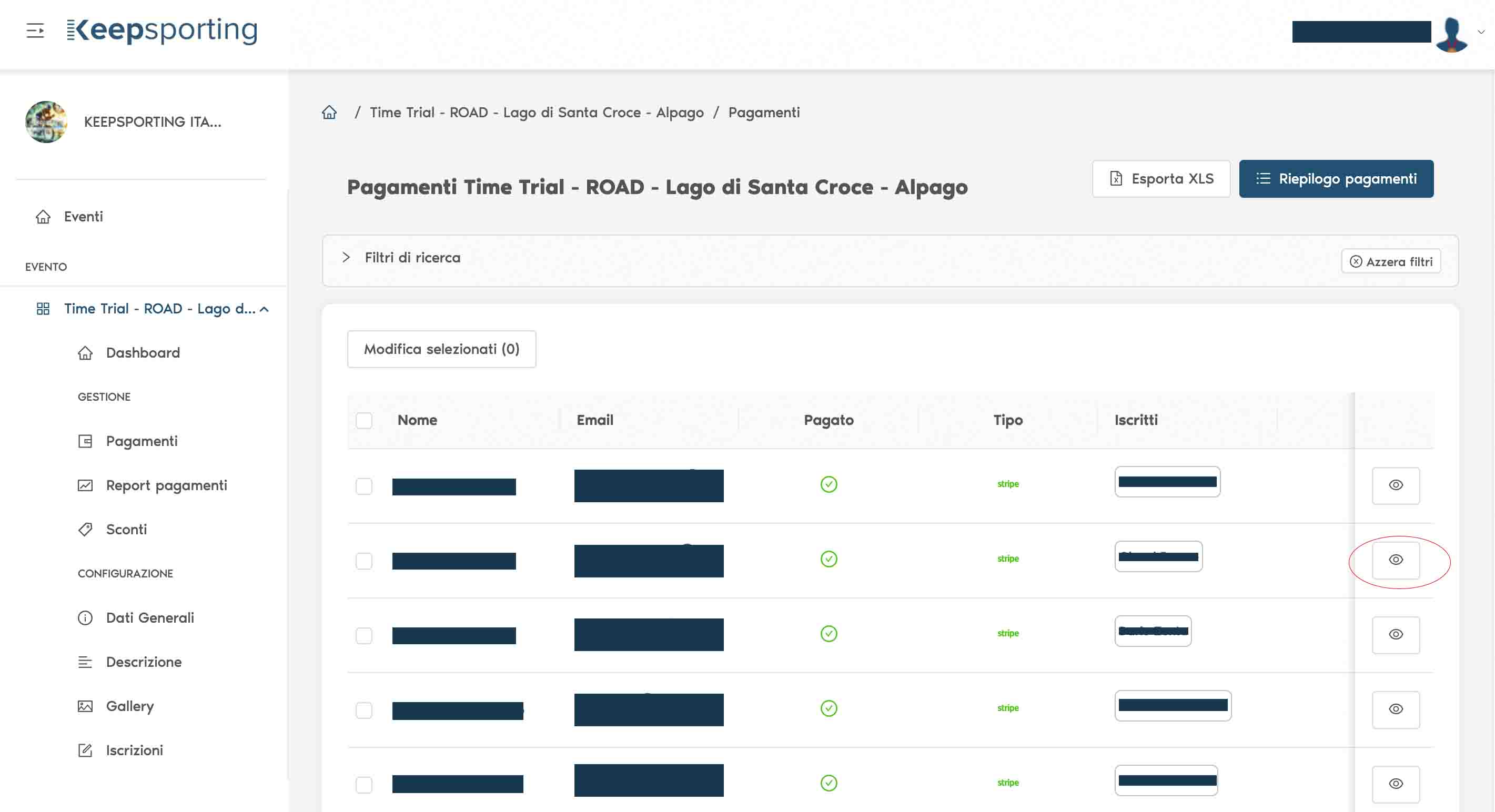 After identifying the athlete whose registration you want to delete, access their payment record by clicking on the eye icon.