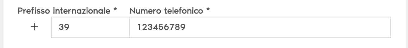 Second field: Enter the international prefix of your country (e.g., 39 for Italy). The international prefix must contain only digits, so do not insert any letters, special characters, or spaces.