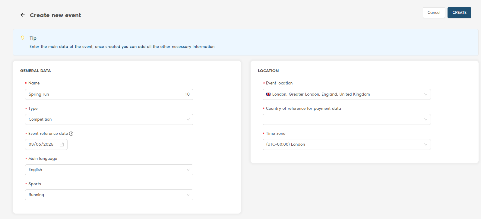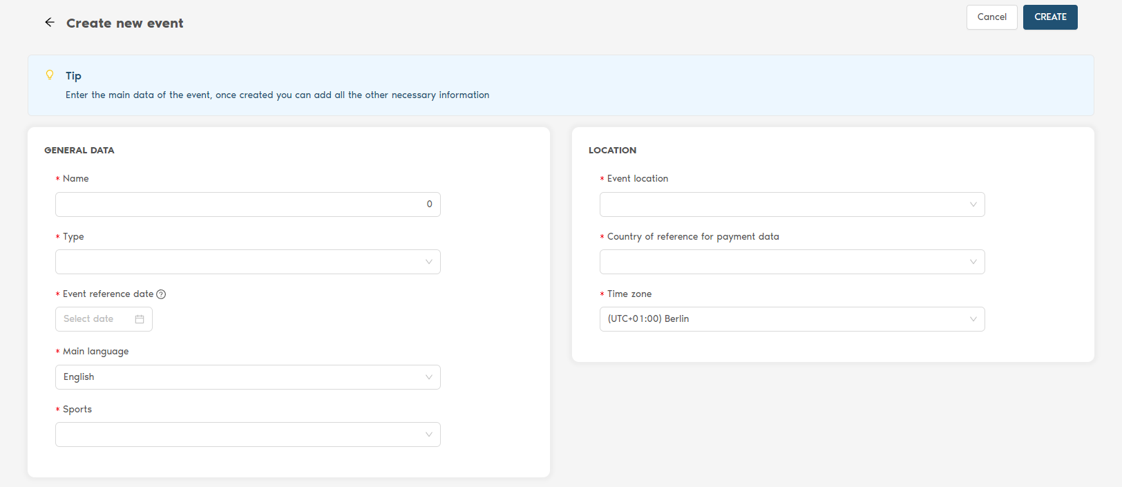 The first thing to do, once you have entered the EMP, is to click on the "+ Create" button which takes you to the page for entering the main data of the event: name of the event, type of event (competition, training, course, etc...), date, main language, sport, location, country.