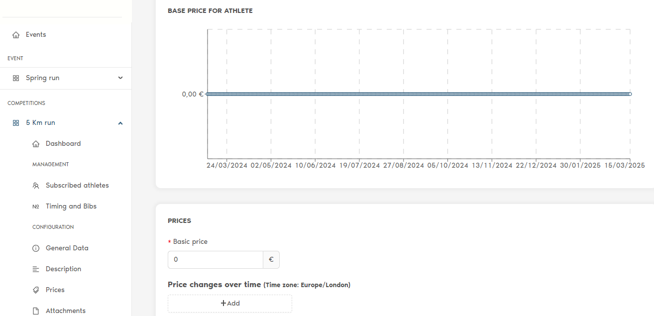 Once the sub-event has been created, go to the left menu: in "Prices" you can enter the price of the event (if registrations are free, enter the value zero).