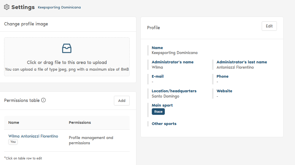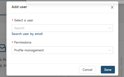 Now enter the email address of the user you want to give permission to manage your organizer page (this user must, of course, have a personal Keepsporting profile) and select from the dropdown menu whether to grant them 'Profile management' permission or 'Profile and permissions management' permission (in the latter case, the user will be able to grant permission to other users to manage the page as well):