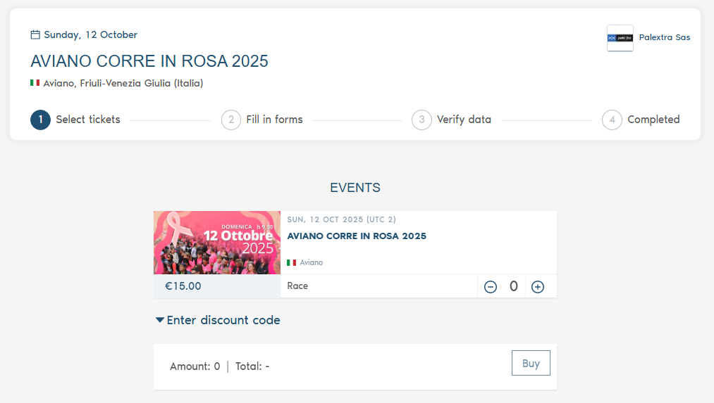 - You will find fields where you can enter the number of tickets you want to purchase, and below, a dropdown menu that says 'Enter discount code'.