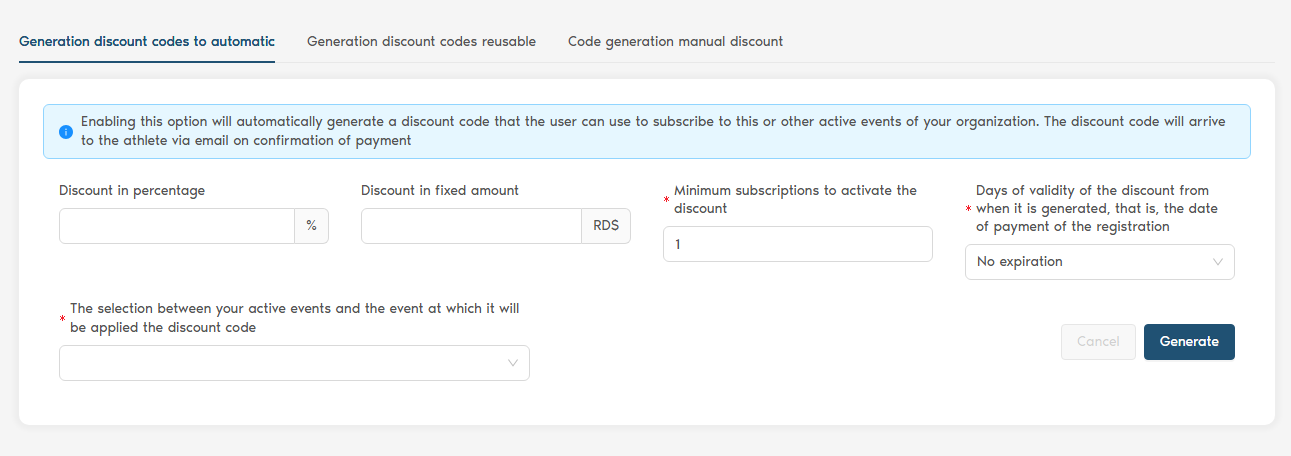 Suppose your registration fee is R$ 60.00, and you want to offer R$ 10.00 off for athletes, bringing the final price to R$ 50.00. In the “Fixed Amount Discount” field, enter the number “10” and the number of discount codes you wish to generate. Then click the “Generate” button. The data will be generated; simply copy the discount code and send it to the athlete, group, team, or agency.