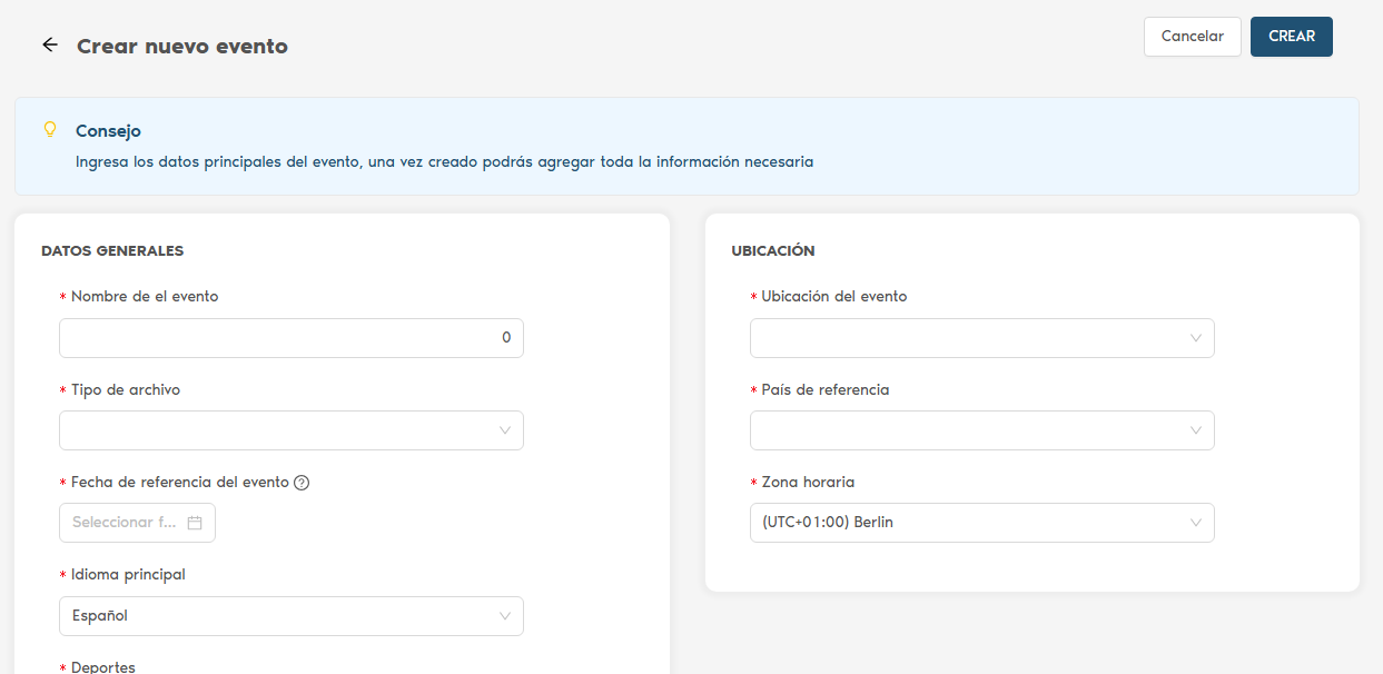 Lo primero que debe hacer, una vez que haya accedido a la EMP, es hacer clic en el botón '+ Crear', que le llevará a la página para introducir los datos principales del evento: nombre del evento, tipo de evento (competición, entrenamiento, curso, etc.), fecha, idioma principal, deporte, ubicación y país.
