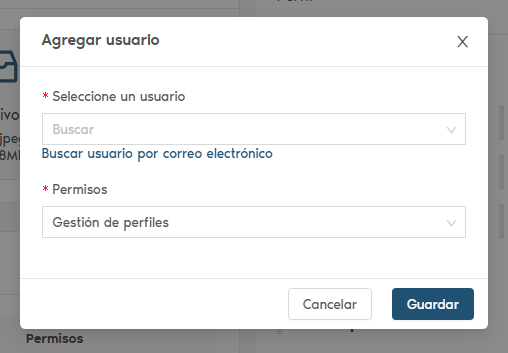 Ahora introduce la dirección de correo electrónico del usuario al que deseas dar permiso para gestionar la página de tu organizador (este usuario, por supuesto, debe tener un perfil personal de Keepsporting) y selecciona en el menú desplegable si deseas otorgarle el permiso 'Gestión del perfil' o el permiso 'Gestión de perfiles y permisos' (en este último caso, el usuario también podrá conceder permiso a otros usuarios para gestionar la página):