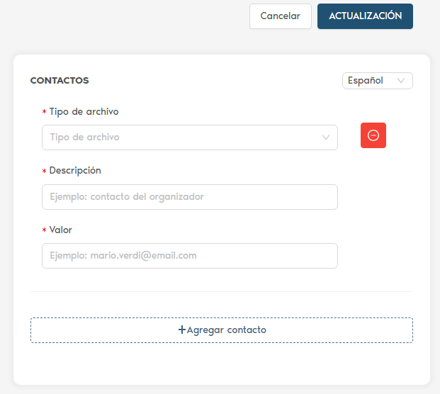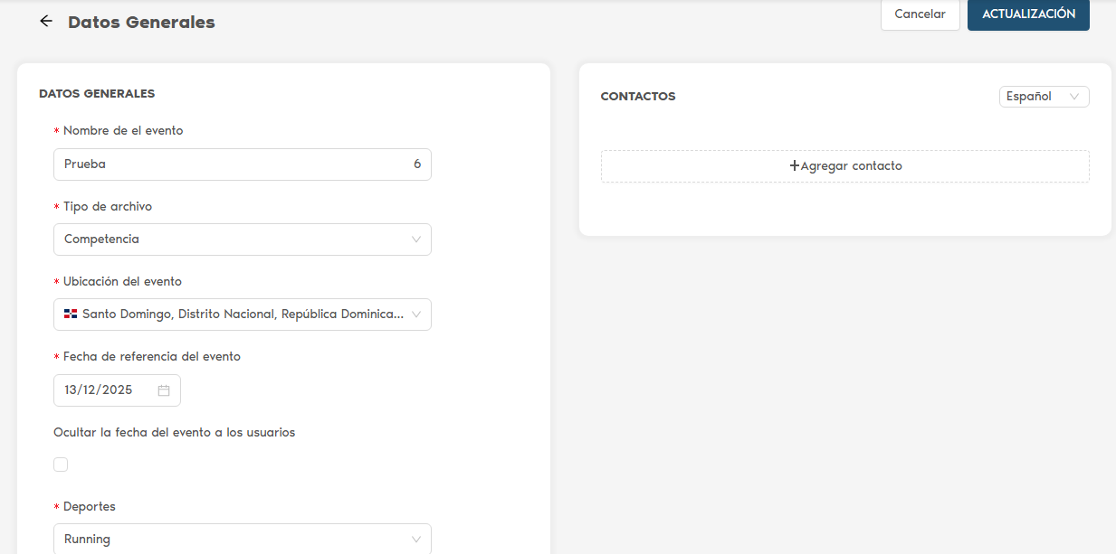 En el panel de tu evento, busca en el menú lateral izquierdo la opción: 'Datos Generales'. Haz clic en ella y se abrirá la página de configuración de contactos, como se muestra en la imagen a continuación.