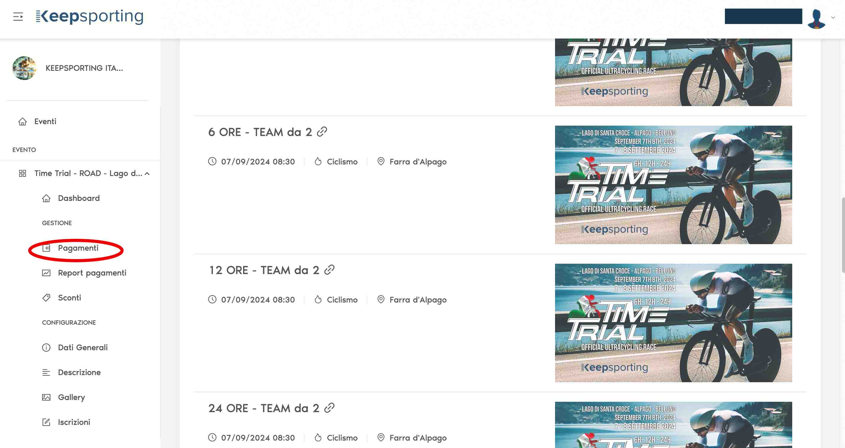 Una volta selezionato l'evento, andiamo alla sezione "PAGAMENTI" che si trova a destra.