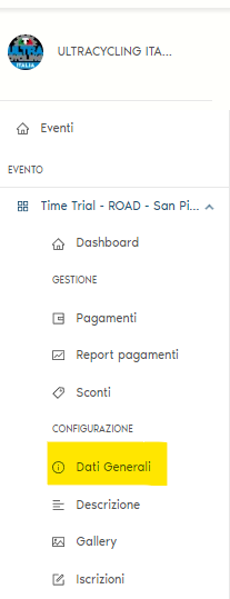 Poi vai sulla DASHBOARD del tuo evento e clicca su DATI GENERALI.