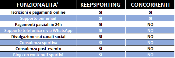 Keepsporting è una piattaforma progettata per soddisfare le richieste degli organizzatori di eventi sportivi, contenente tutti gli strumenti necessari per gestire le iscrizioni e i pagamenti online e molte altre risorse tecnologiche e innovative per il tuo evento. Siamo presenti in Italia e in altri paesi del mondo, essendo una piattaforma multi-sport e multilingua. Per scoprire le sue funzionalità basta accedere al sito www.keepsporting.com e registrarsi gratuitamente.