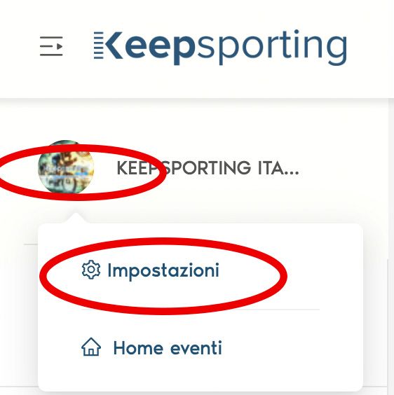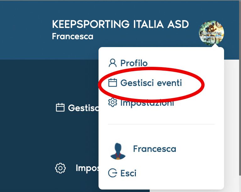 Dopo aver effettuto correttamente il login con il tuo nome utente e password, clicca il logo della tua organizzazione. Nel nostro esempio, useremo KEEPSPORTING ITALIA ASD come riferimento e cliccheremo su "Gestisci eventi".