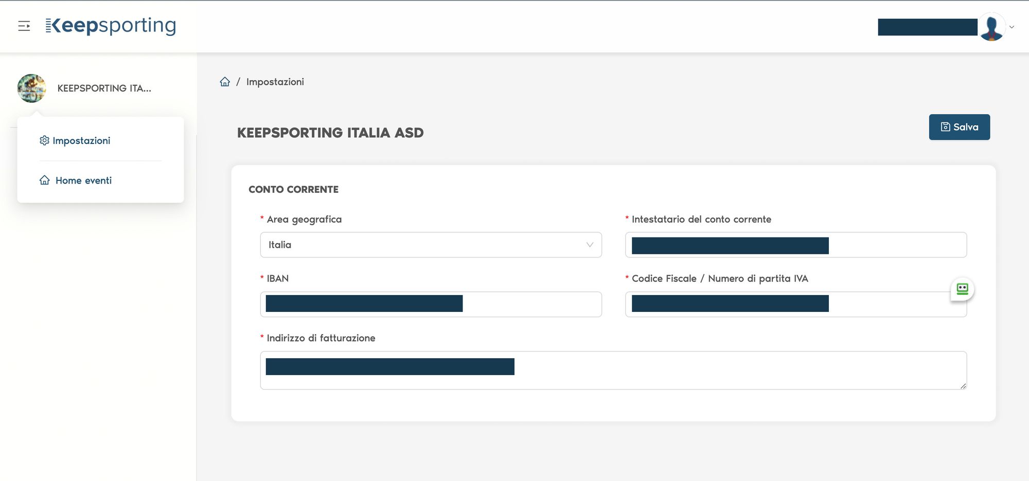 Nella sezione "Impostazioni", inserisci correttamente tutti i dati relativi al conto corrente della tua organizzazione. Assicurati di compilare ogni campo richiesto con attenzione per evitare errori nei pagamenti. Una volta inseriti i dati, clicca su "SALVA".
