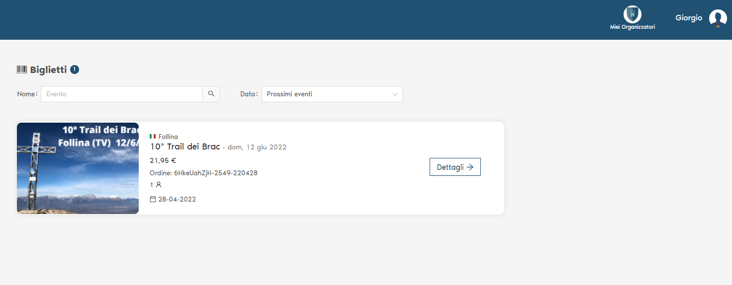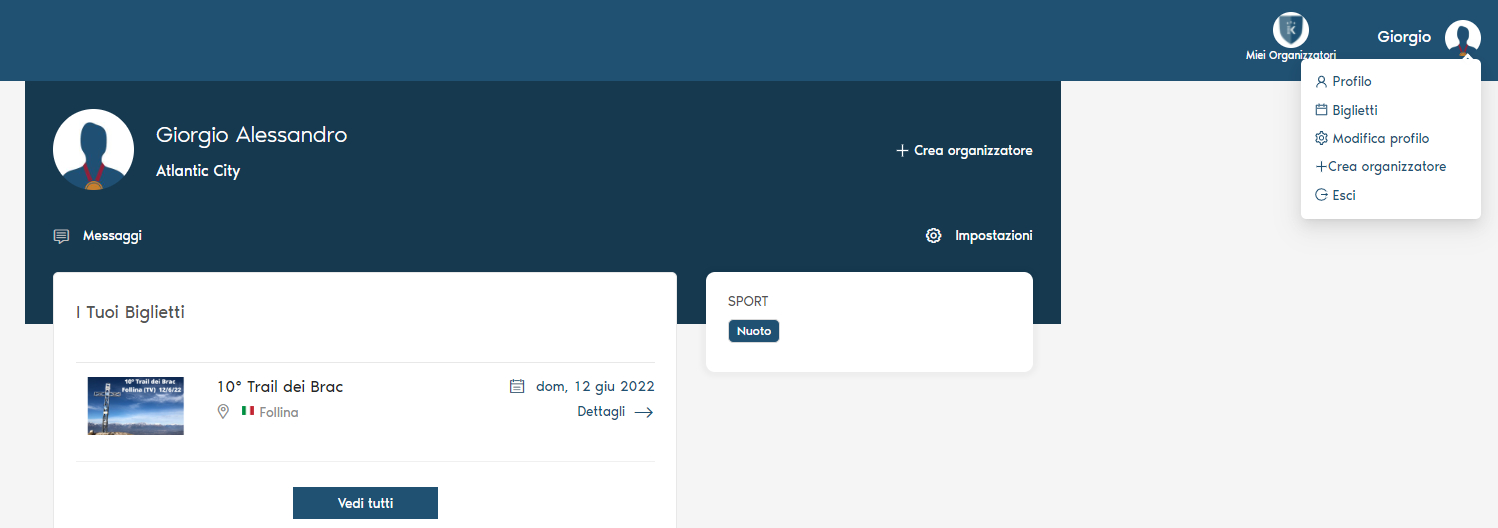 - Nel tuo profilo di atleta, clicca in alto a destra sul tuo nome e poi sulla scritta "Biglietti" come indicato nell'immagine sotto.