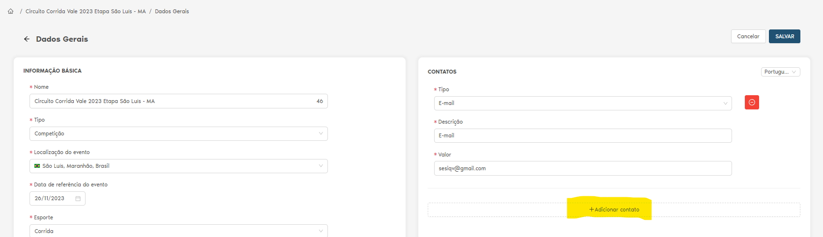 Olá, seja bem-vindo a este tutorial sobre como inserir os dados de contato da sua associação esportiva em seu evento.