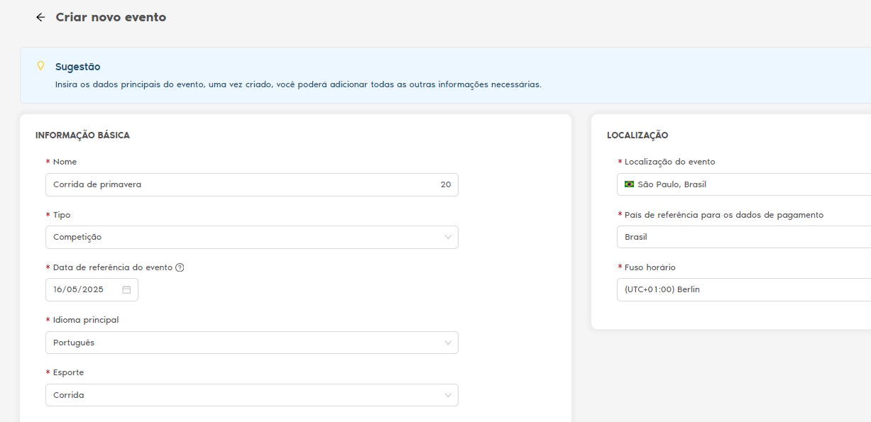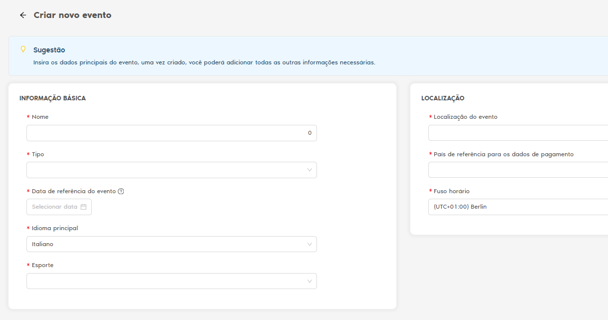 O primeiro a se fazer, depois de entrar no EMP, é clicar no botão “+ Criar” que o levará à página de inserção dos principais dados: nome do evento, tipo de evento (competição, treinamento , curso, etc...), data, idioma principal, esporte, local, país.