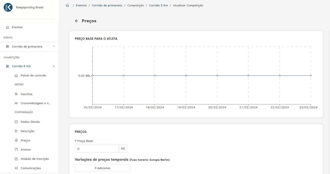 Uma vez criada a etapa, vá ao menu esquerdo, no item “Preços” da etapa e insira o preço (se as inscrições forem gratuitas, insira o valor zero).