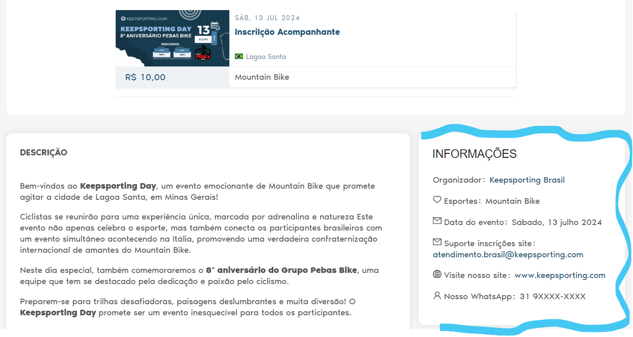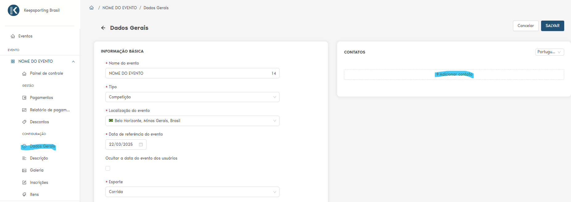 Seja bem-vindo a este tutorial sobre como inserir os dados de contato da sua organização em seu evento. Essa é uma boa prática, pois permite-lhe ter uma comunicação melhor e mais rápida com os seus clientes e estabelecer uma relação de confiança cada vez mais próxima, afinal, o que seria dos eventos sem nossos precisos atletas?