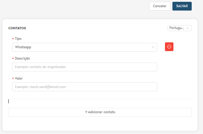IMPORTANTE: Você pode adicionar 1 ou mais tipos de contato!