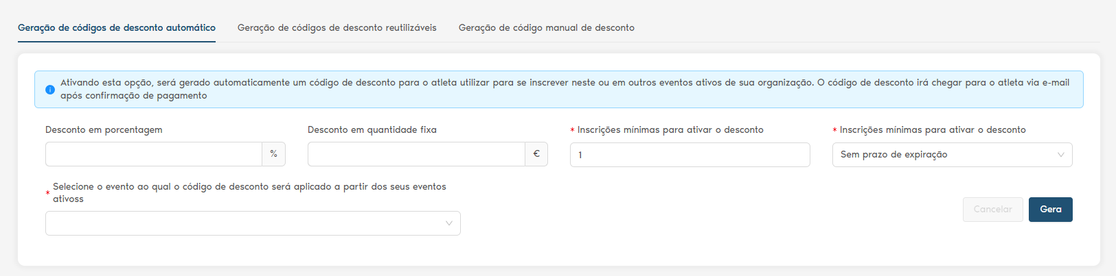 Supondo que sua inscrição é no valor de R$ 60,00 e você deseja conceder 50% de desconto para alguns atletas, apresentando o valor final de R$ 30,00, no campo “Desconto em porcentagem” informe o numeral “50” e a quantidade de codigos de descontos que você deseja gerar, logo após você clique no botão “Gera”. Os dados seram gerados, basta você copiar o código de desconto e enviar