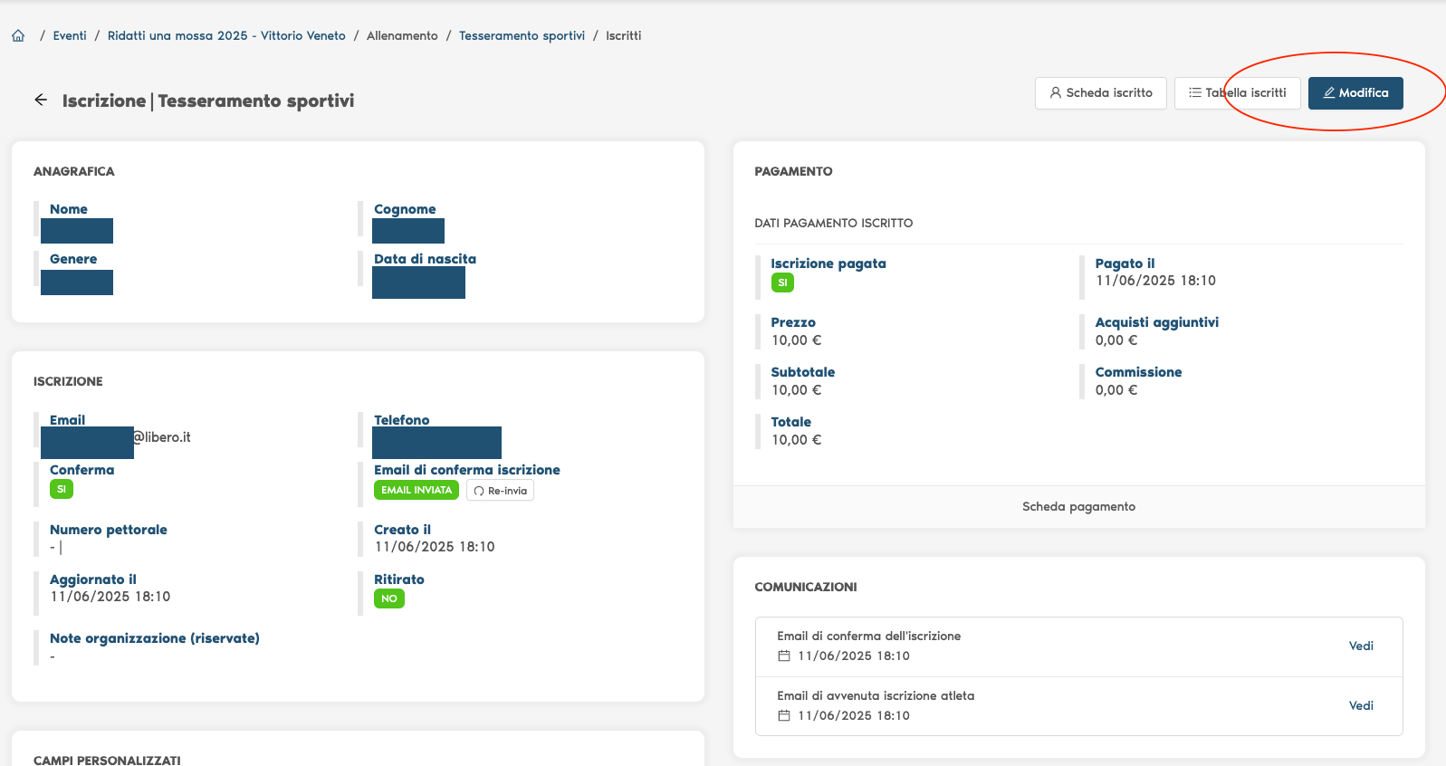 Dentro da ficha do atleta, clique no botão “Modificar” (Modifica) para aceder aos campos editáveis.