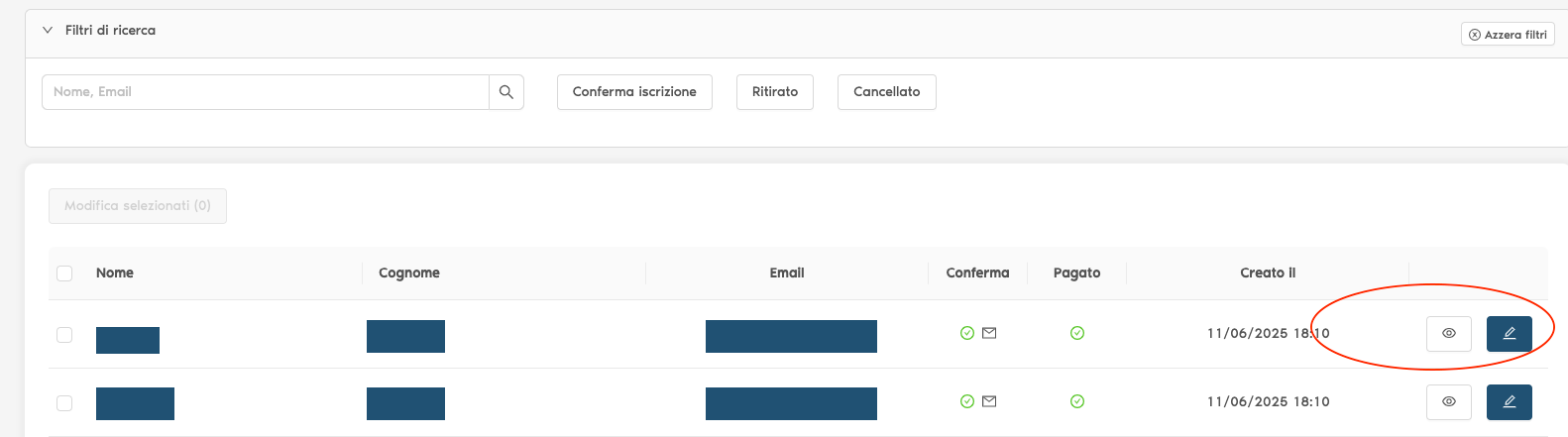 Encontre o inscrito na lista e clique no ícone em forma de olho, situado à direita, para abrir a ficha dele.