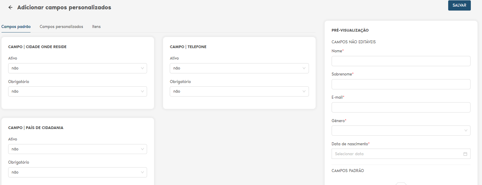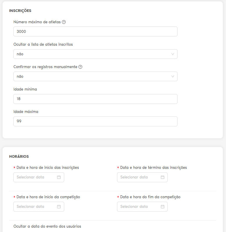 Os campos padrão do formulário de inscrição são: (nome, sobrenome, e-mail, gênero e data de nascimento). Você pode incluir outros campos no formulário como: cidade, telefone, equipe, tamanhos de camisetas, ou seja, quantos desejar!