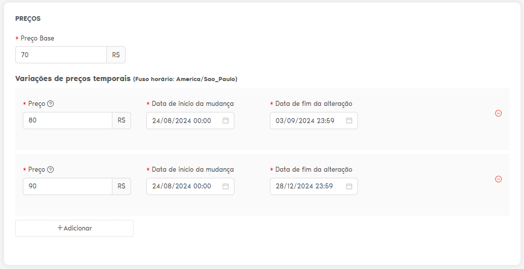 Caso as inscrições tenham variações de preço (viradas de lote) elas poderão ser configuradas automaticamente tanto por data quanto por quantidade de inscrições. Insira o preço de registro e alterações de preço, se houver.