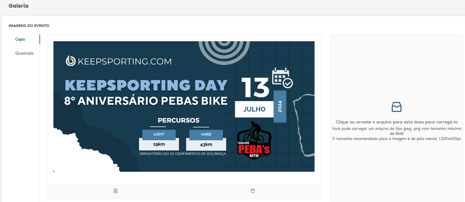 Se você possui uma imagem de capa do evento, principalmente no formato 1200px X 600px, pode importá-la na plataforma.