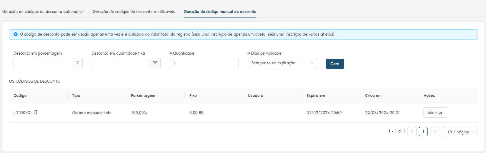 Código manual de desconto: O código de desconto pode ser usado apenas uma vez e é aplicado ao valor total do registro (seja uma inscrição de apenas um atleta, seja uma inscrição de vários atletas).
