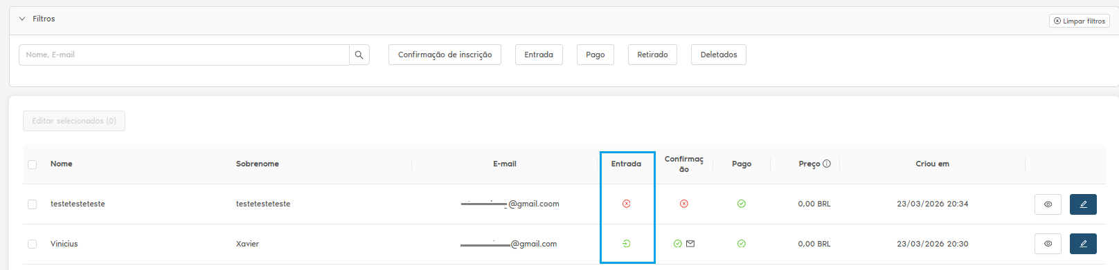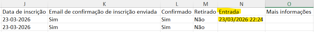 1.1 Na tela principal dos inscritos, é possível visualizar na lista através do cabeçalho "Entrada".