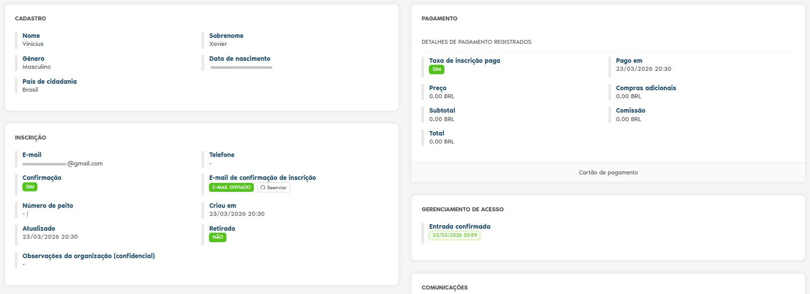2.1 Nos detalhes do atleta, é possível visualizar na opção "GERENCIAMENTO DE ACESSO" com a entrada confirmada seguida da data e horário.